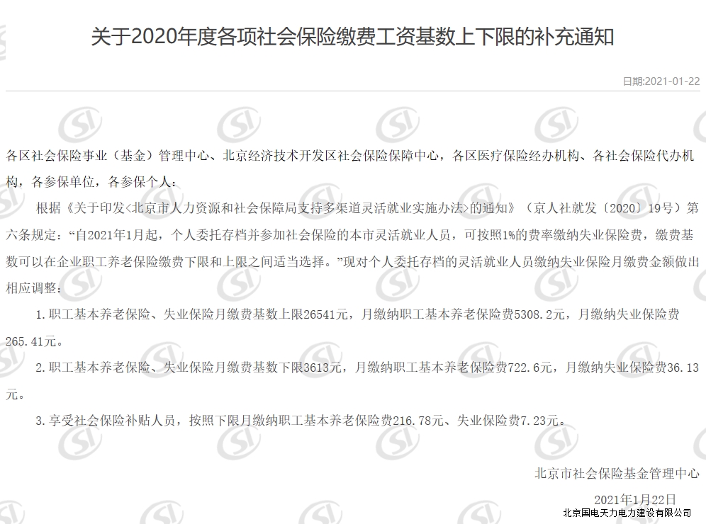 关于2020年度各项社会保险缴费工资基数上下限的补充通知
